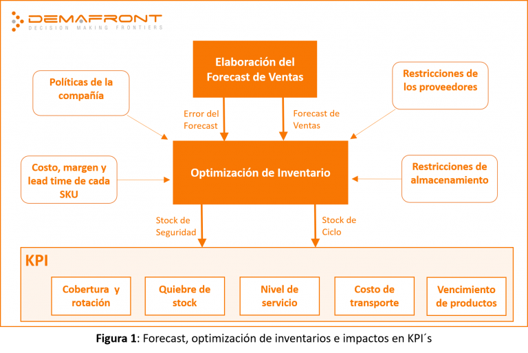 El resultado final de los KPI que “mueven la aguja”, por ej.: i) Cobertura de Inventario, ii) Nivel de Servicio, iii) Costos Logísticos, dependerá de la adecuada definición de Stock de Seguridad y de Ciclo. Otro aspecto a destacar es la necesidad de que en este proceso no sólo se considere el Forecast de Venta, sino que también su error histórico. La figura 1 sintetiza lo anterior y hace explícito el impacto de estas decisiones sobre los KPI mencionados.