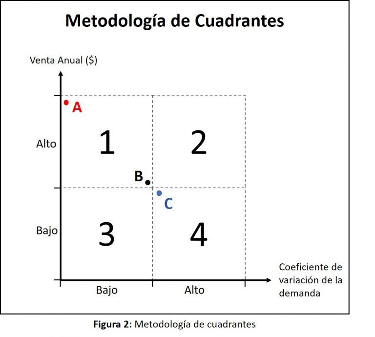 Para ilustrar esta debilidad, podemos señalar que en algunos programas de postgrado se propone una clasificación que agrupa los SKU en cuadrantes, considerando dos dimensiones que generalmente son: coeficiente de variación de los errores de pronóstico y volumen de venta valorizado (ver figura 2).