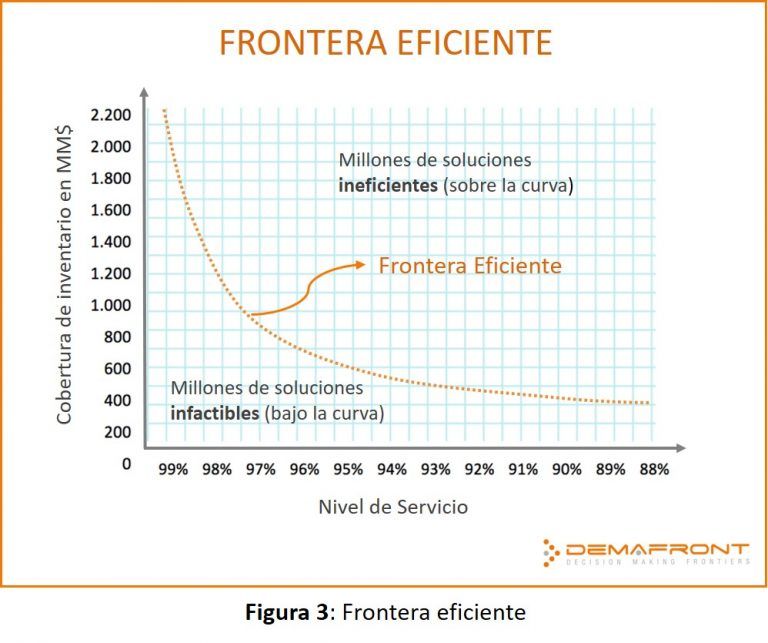 Esta Frontera permite además, identificar las alternativas infactibles (puntos bajo la curva), y las alternativas ineficientes (puntos arriba de la curva). En consecuencia, las empresas que utilizan esta metodología versus la aplicación del enfoque de cuadrantes obtienen mejoras significativas en sus KPI (Cobertura de Inventario, Nivel de Servicio, Costos Logísticos).